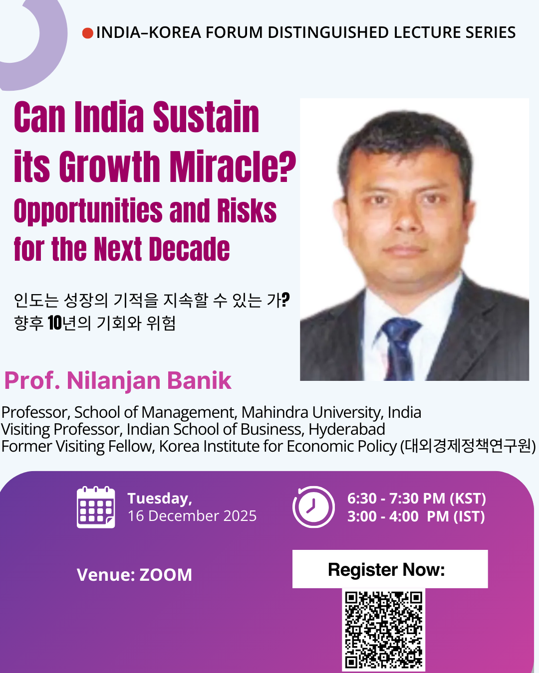 This distinguished lecture will examine India’s growth trajectory, assess key structural challenges and risks, and discuss the broader implications for India–Korea economic cooperation.