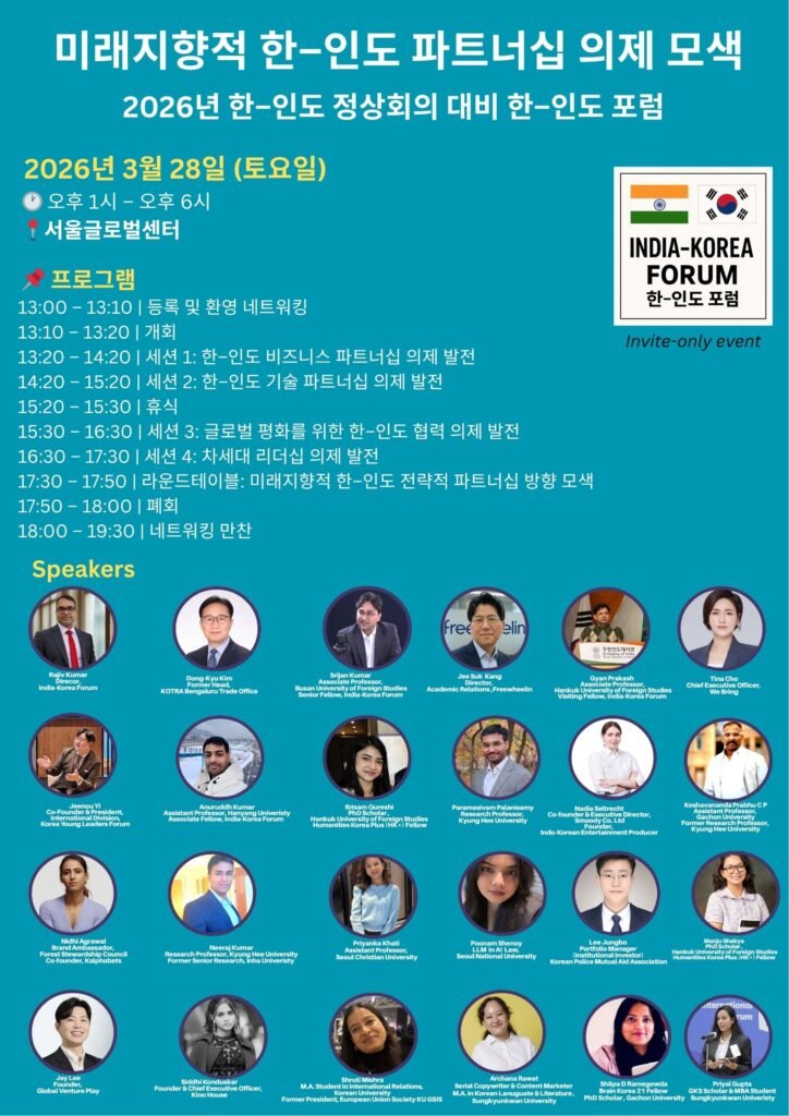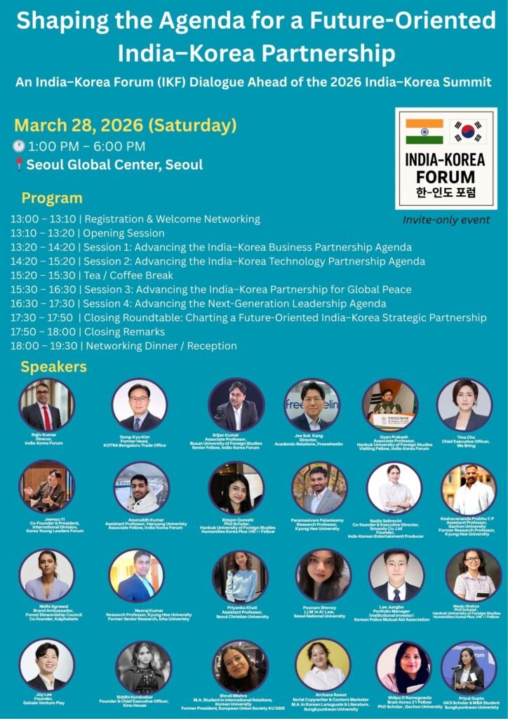 The India–Korea Forum (IKF) successfully organized a dialogue titled “Shaping the Agenda for a Future-Oriented India–Korea Partnership” on March 28, 2026, at the Seoul Global Center, ahead of the upcoming India–Korea Summit.